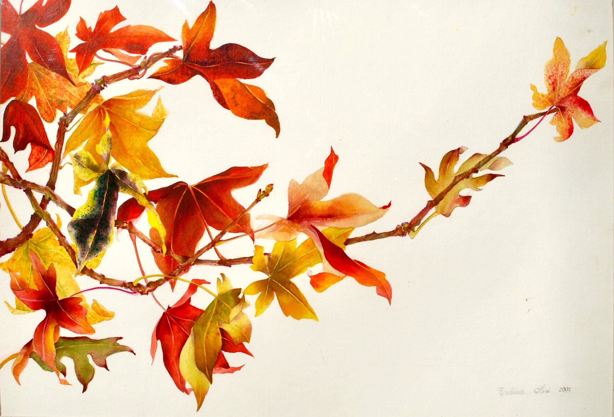 Lavorerai con la palette autunnale completa partendo da una base violacea: rossi appassionati, gialli dorati, arancioni vibranti e marroni profondi che nascono da sovrapposizioni armoniose.